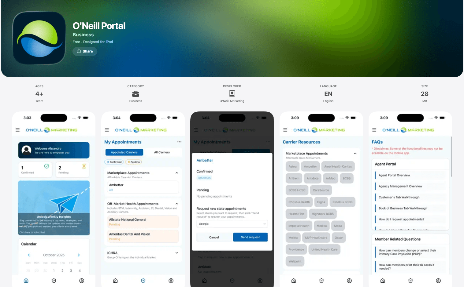 O'Neill mobile app for the biggest insurance FMO in the USA to empower agents with tech and speed to sell ACA, PPO, dental, life & more (ios & android)